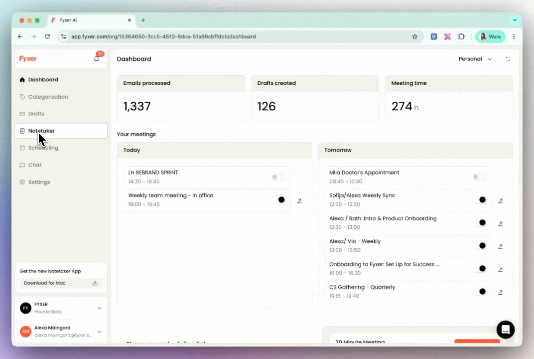 One of Fyxer's more distinctive features is its dual functionality as both an inbox assistant and a meeting notetaker. It can join meetings and automatically generate summaries and action items afterward, which is particularly useful for founders, consultants, or account managers moving through multiple calls per day.