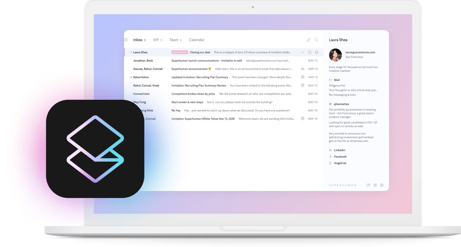 Superhuman operates on a "Split Inbox" philosophy powered by local-first AI.