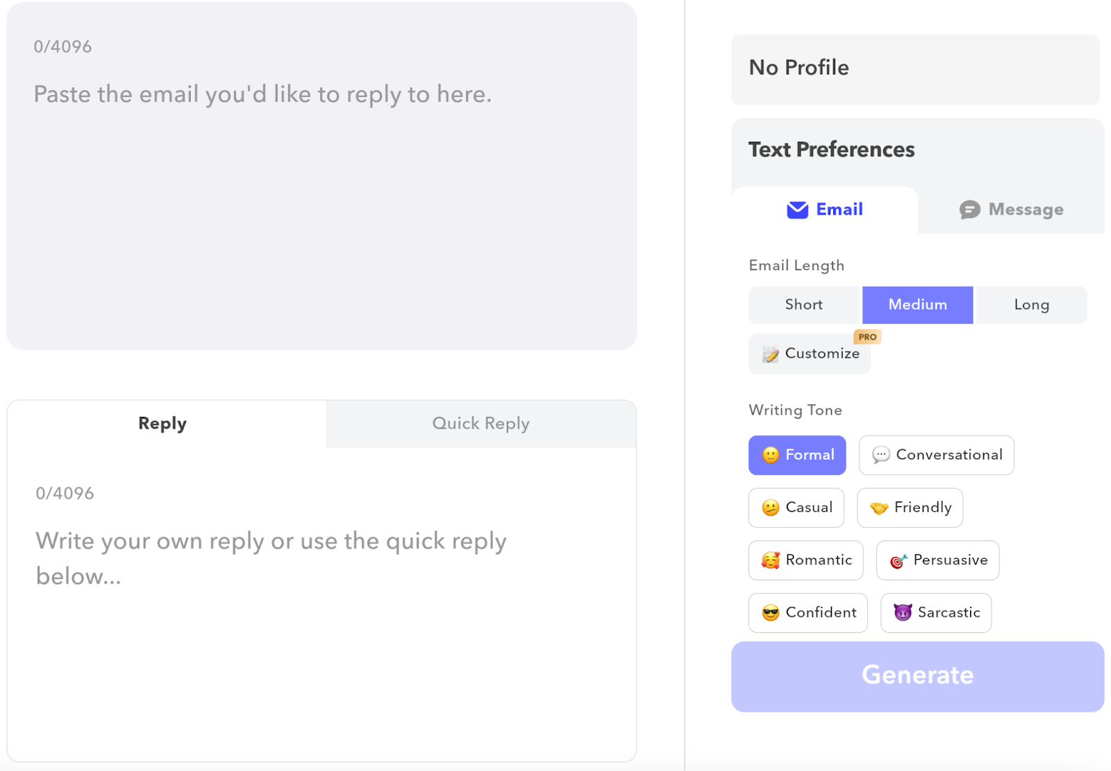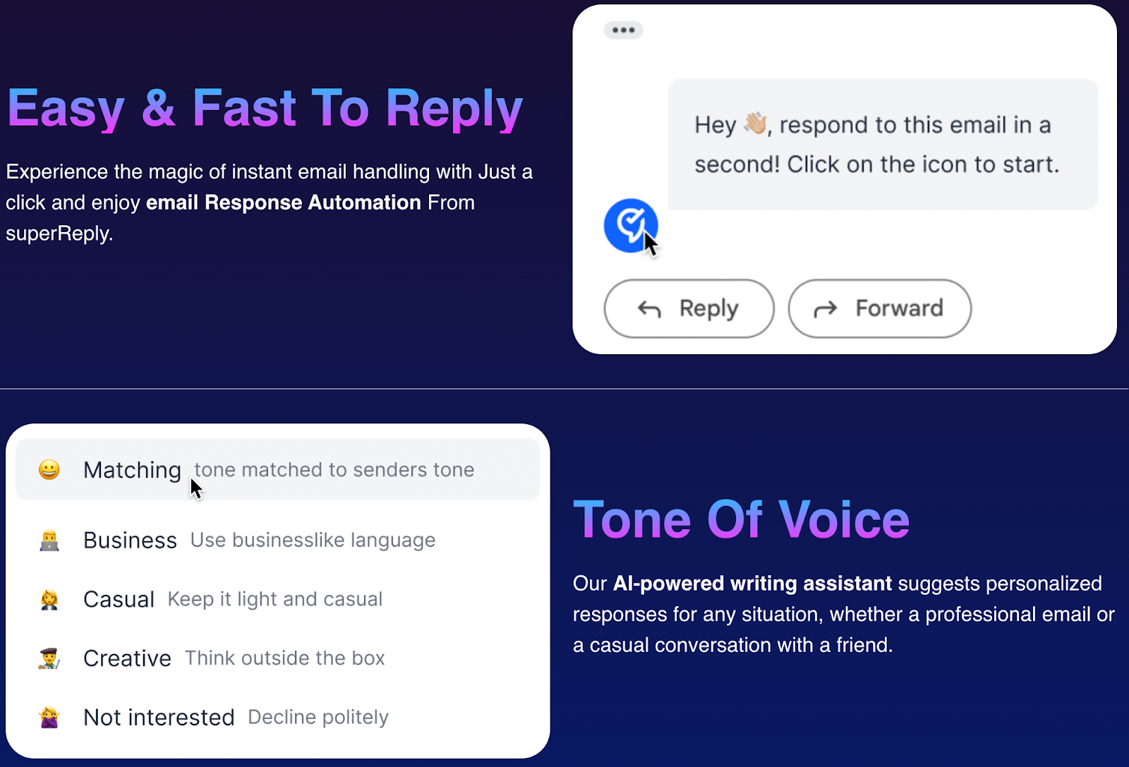 SuperReply is designed for quick reply generation inside email clients. It helps users handle repetitive messages efficiently.