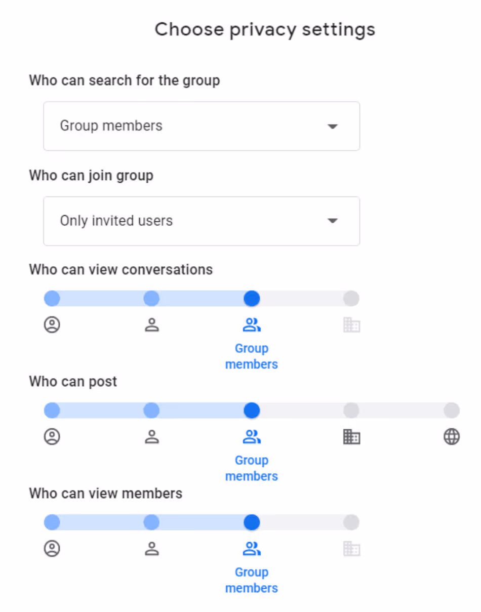 Not every conversation should be open to everyone, and Google Groups makes access control straightforward. Admins can define who can join a group, who can post messages, who can view conversations, and who can manage members and settings.