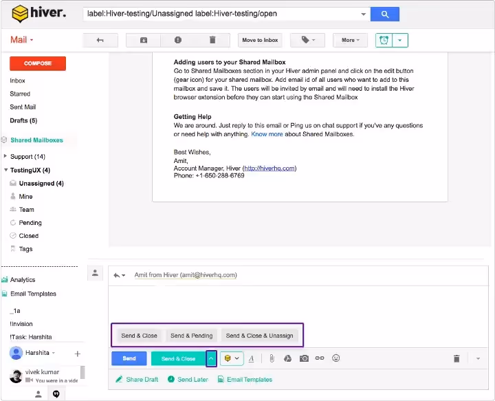 Hiver ist eine weitere für Gmail entwickelte Software für gemeinsame Posteingänge, die eine Reihe von Funktionen bietet, darunter E-Mail-Zusammenarbeit, Regeln, Analysen und Einweg-Integrationen mit Tools wie Asana und Jira. Sie ist bekannt für ihre übersichtliche und intuitive Oberfläche und eine gute Wahl für kleine Teams, die Gmail als Helpdesk verwenden möchten.