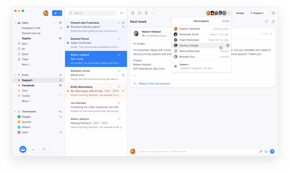 Front ist eine weitere sehr beliebte Software für gemeinsam genutzten Posteingang, die alle unverzichtbaren Funktionen einer typischen App für gemeinsam genutzten Posteingang bietet, darunter gemeinsame Posteingänge, E-Mail-Notizen, Automatisierungsregeln, Analysen, Unterstützung für andere Kanäle wie WhatsApp und Instagram sowie Integrationen mit beliebten Tools. Es ist als gute Alternative zu älteren Helpdesk-Lösungen bekannt und wurde in erster Linie für Kundenservice-Teams entwickelt.
