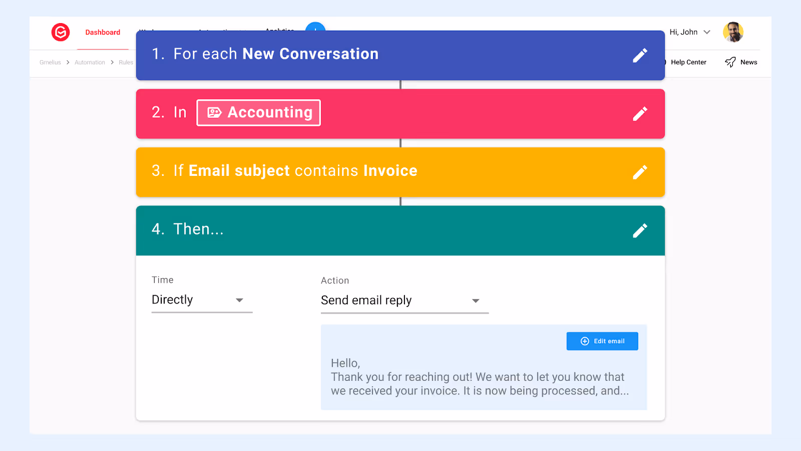 Wenn Sie einer einfachen „Wenn dies, dann das“ -Logik folgen, können Teammitglieder bestimmte E-Mails dem richtigen Kollegen zuweisen. Nehmen wir zum Beispiel an, eine E-Mail hat „Rechnung“ in der Betreffzeile. In diesem Fall kann die E-Mail automatisch der Buchhaltungsabteilung zugewiesen werden. Dadurch wird eine einzelne Abteilung zur Rechenschaft gezogen, anstatt einen Zustrom von E-Mails für Ihr gesamtes Unternehmen zu haben, um sicherzustellen, dass dies nicht für alle gilt.