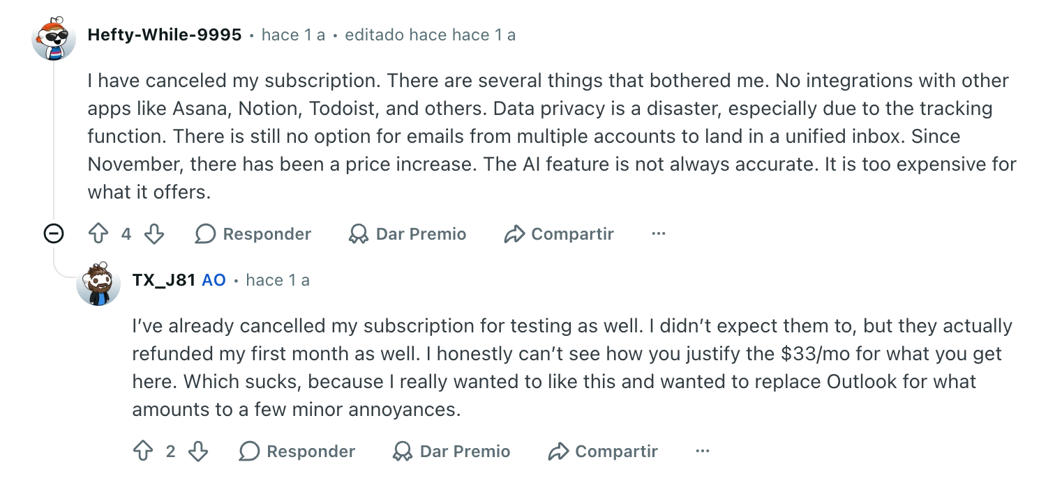 At $30/user/month, Superhuman is still a premium product, a 10-person team pays $3,600 per year just for email. That's easier to justify for founders or executives who treat inbox speed as a competitive advantage, and harder to defend for support or operations teams who need shared workflows and automation on top of individual productivity.