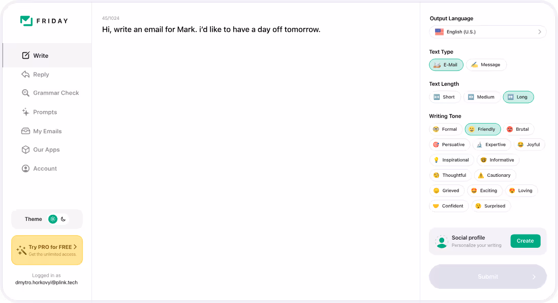Friday ist ein KI-E-Mail-Generator, der von GPT-4 betrieben wird.