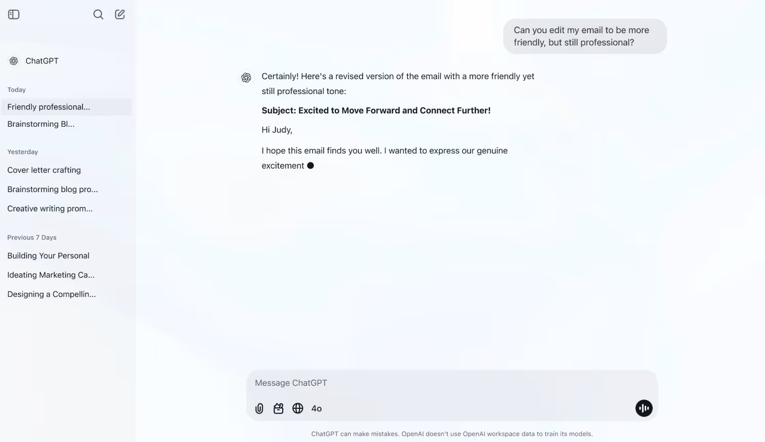 Wenn du dich jemals gefragt hast“Kann KI bei meinen E-Mails helfen?„, dann war ChatGPT wahrscheinlich eines der ersten Tools, die Sie ausprobiert haben. Die fortschrittliche Verarbeitung natürlicher Sprache und die KI der Generation ermöglichen flüssige Interaktionen und eignen sich daher ideal für den persönlichen, pädagogischen und professionellen Gebrauch. ChatGPT kann jedoch nicht in andere Plattformen integriert werden und bietet keine Automatisierungsfunktionen.