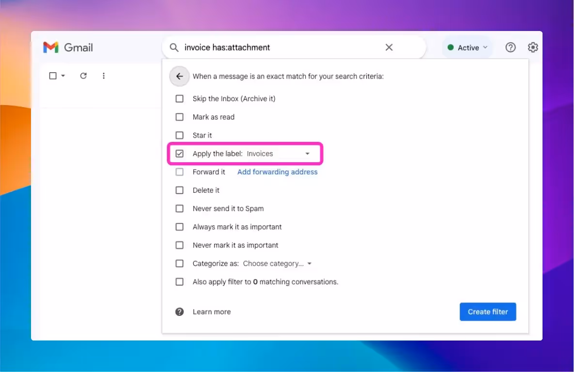 Pick "Apply the label" and choose a label from the ones you've previously created, e.g., "Invoices".