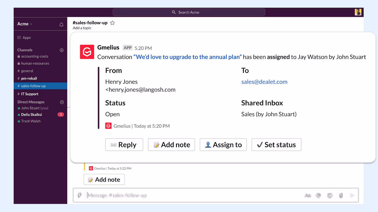 Two-way Integration. Need to communicate a task fast? Gmelius offers integration with Slack, Zoom, and other commonly used platforms for teams. Teams can easily send emails through a Slack channel or schedule Zoom meetings in Gmail to remove the hassle of switching back and forth between applications.