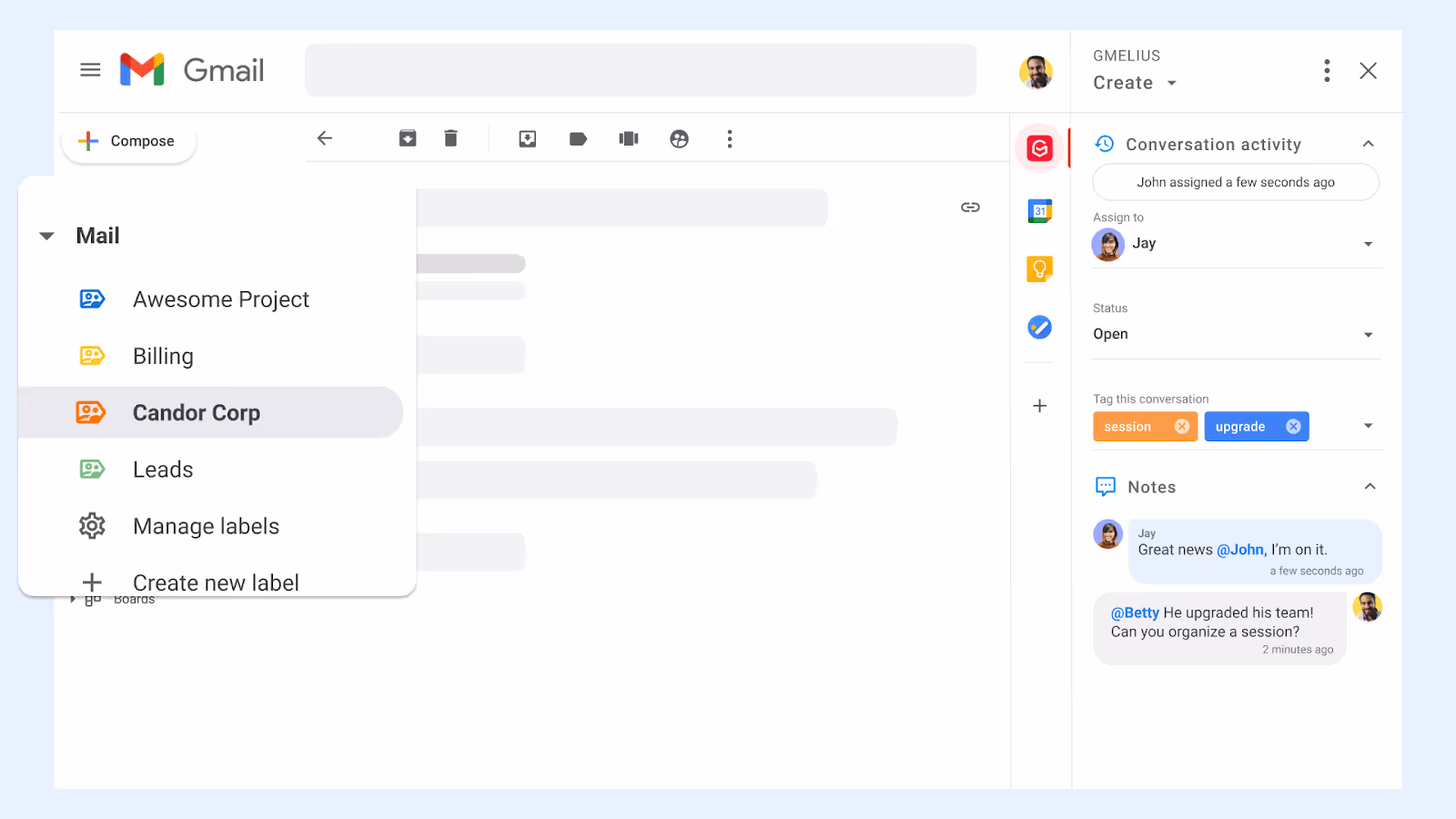 Shared Gmail Labels. As discussed above, Gmail labels can help teams sort and filter incoming emails for better organization. With Gmelius, your team can share new or existing emails within a shared inbox so everyone can work out of the same label to maintain communication and organization.