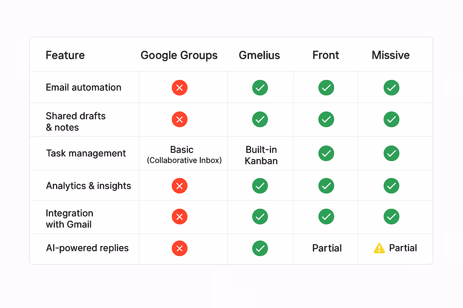 Unlike Slack, Gmelius, or Front, Google Groups is built around asynchronous communication. It works best for structured updates, not fast-paced collaboration.