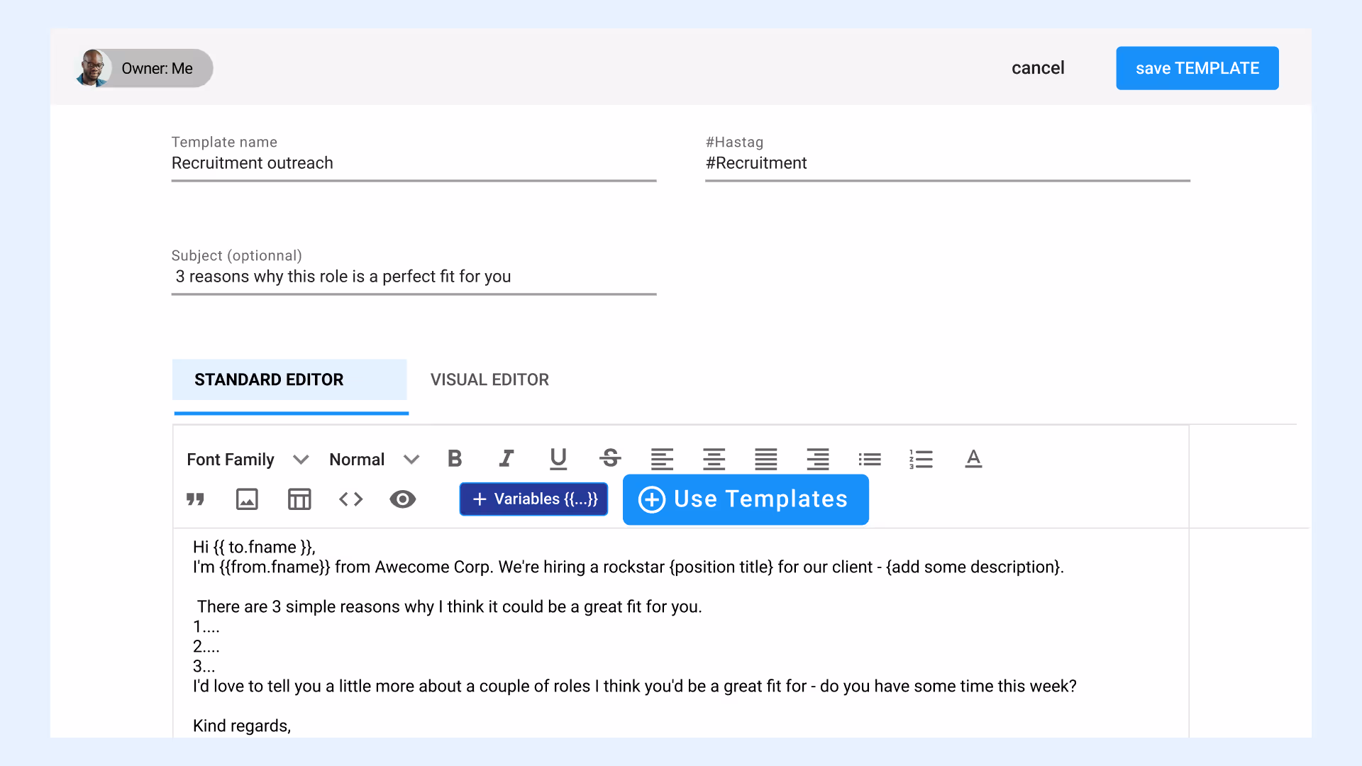 Templates help teams create emails that contain complete, reliable information, yet still allow for personalization. When replying to a client email, simply save the email as a template to use the next time you need to address a similar matter. Email templates can also be used internally for scheduling team meetings or coordinating onboarding with new employees.