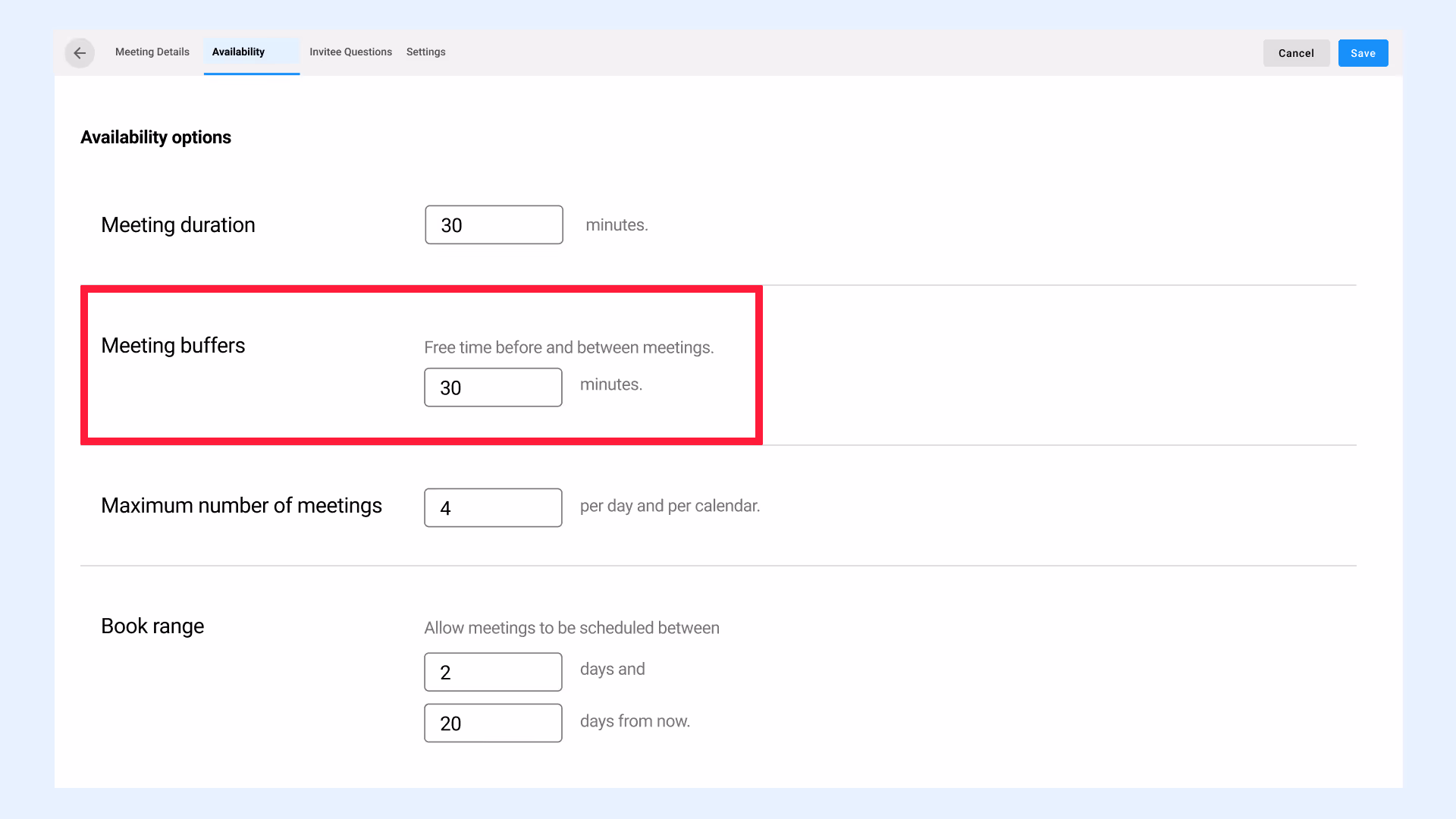 Having too many meetings, or no time between meetings can drain your energy and well-being. Because our #1 value is to care (for our users, our teammates and the work we do), we have also added 2 options to keep you sane and help you balance your days. You can cap the maximum number of meetings that can be booked by day. And you can also set a buffer in between meetings so you can secure time for a needed break.