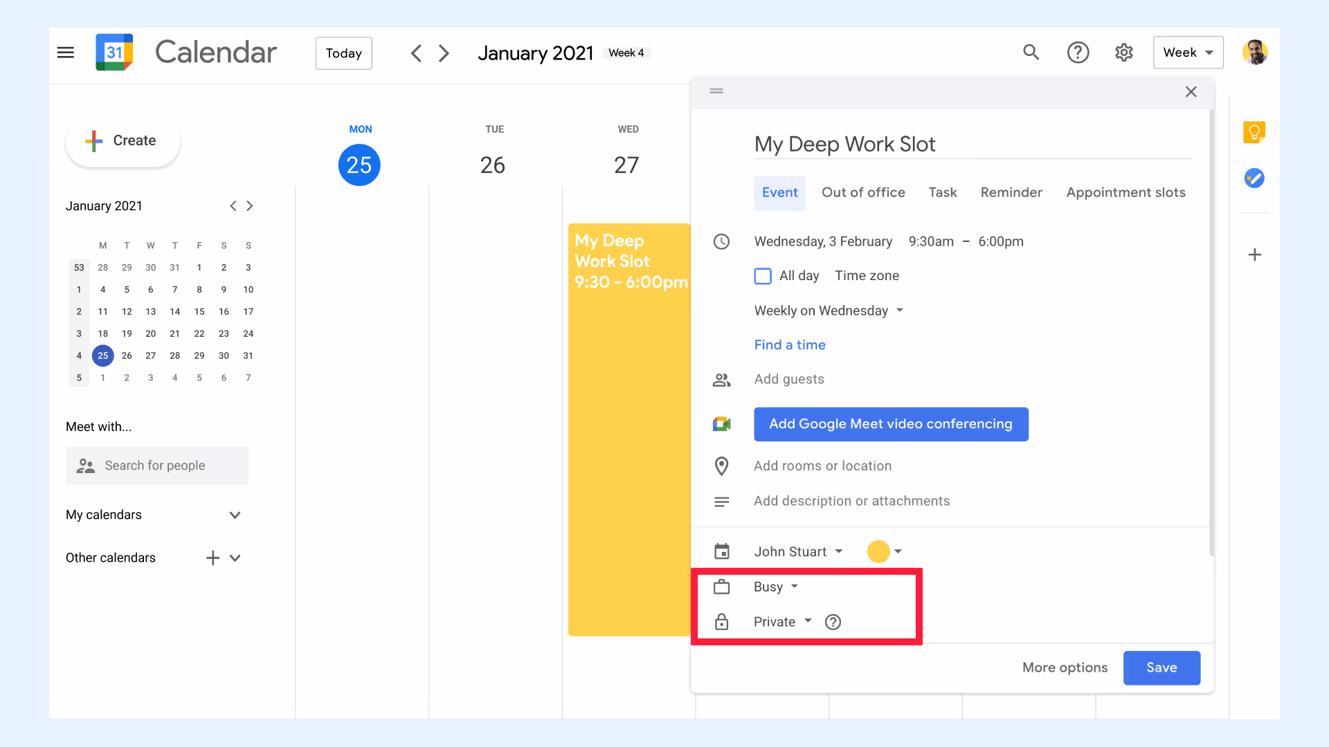 If Deep Work is not yet a company policy, you can still set yourself up for Deep Work using Google Calendar.