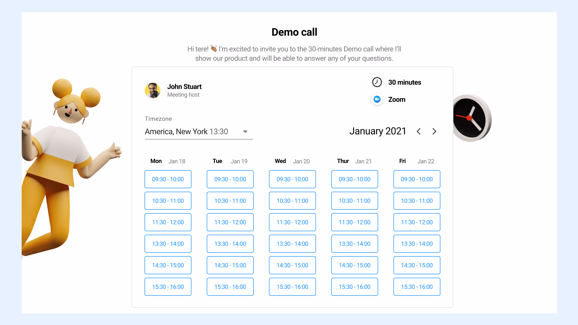 Meeting scheduler integrates with Google Meet and Zoom so the video conferencing link of your choice will be automatically added right inside the appointment slot for you and your guest. Once your guests book a meeting, you will receive an email notification and the slot will be scheduled in your Google Calendar.