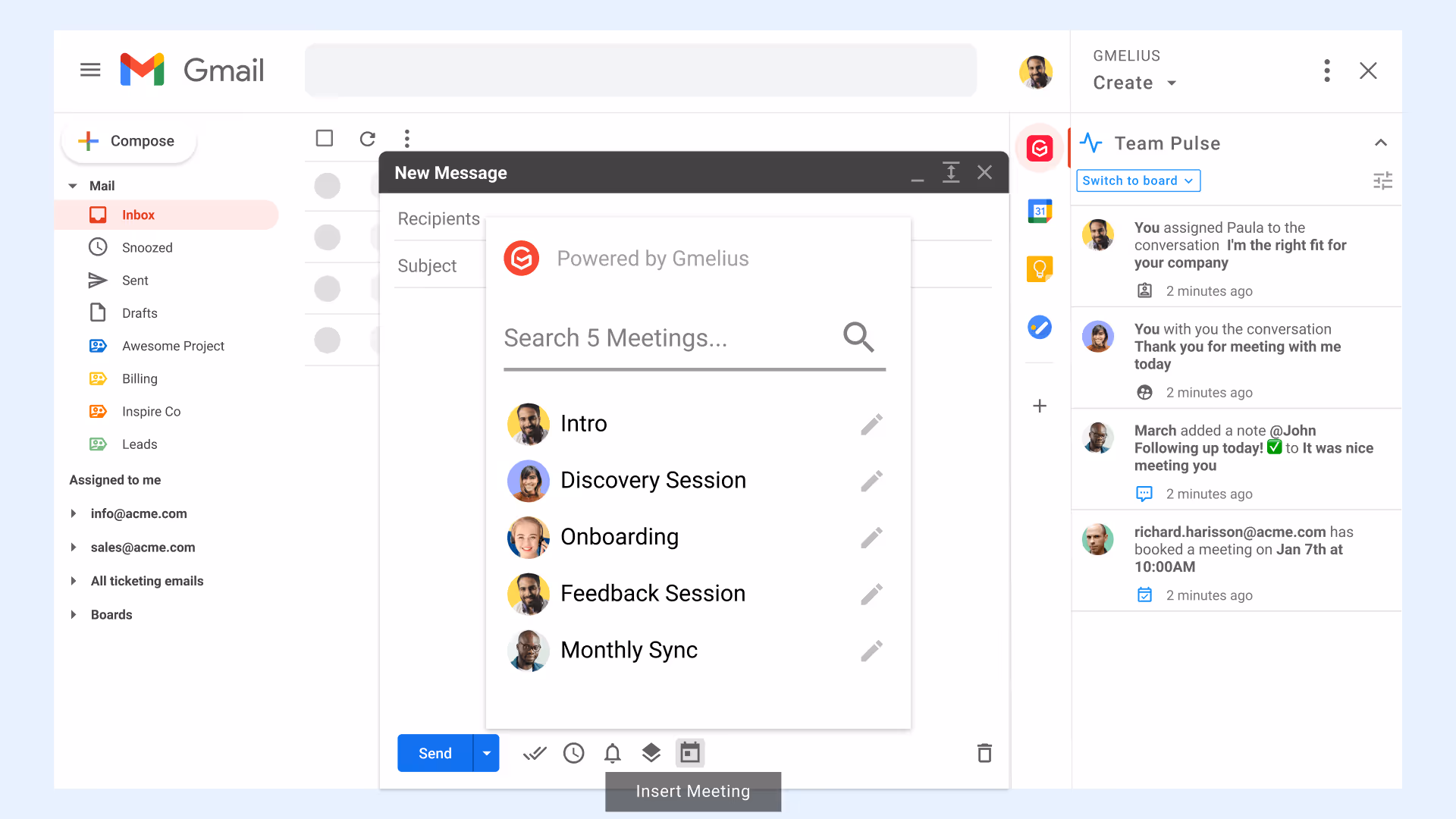 You can set a standard 1:1 meeting, or create as many meeting types as needed to fit your processes. From your Gmail compose window, you can access all your defined meetings and select the one to insert. Are you working in sales? Typical meeting invites like demos, discovery, onboarding, and more can be automated.
