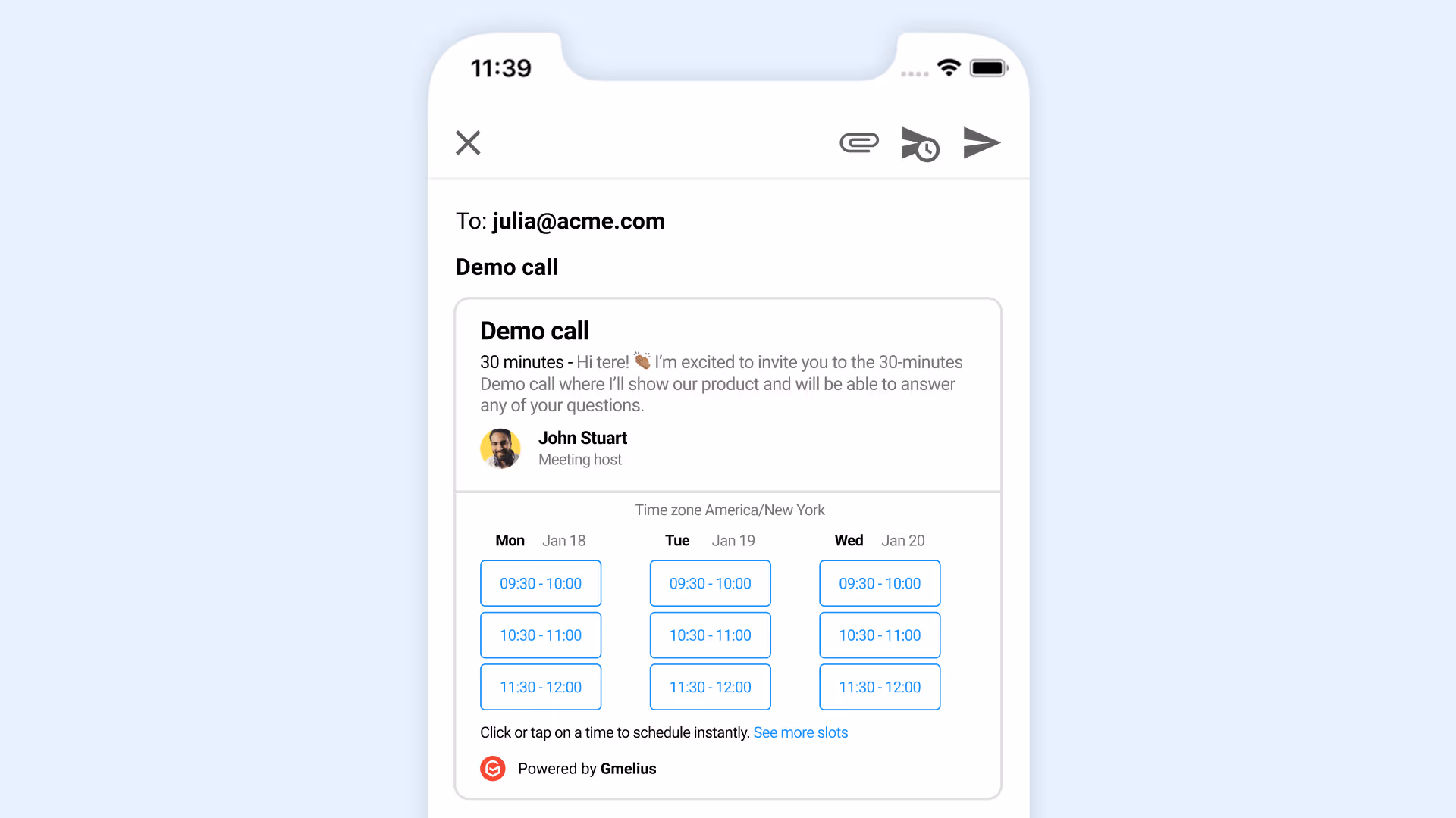 You can also retrieve your list of meetings on the go using the Gmelius mobile app, and insert your appointment slots as you compose your email from your smartphone.