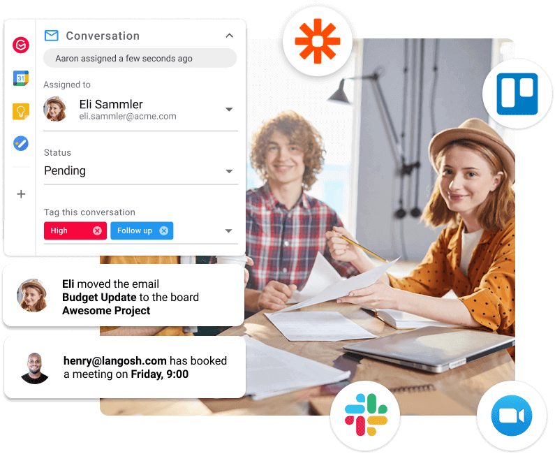 Alignment is key to growth. Information silos slow you down. Have a Sales team working in Gmail, a Product team working in Slack, and a Marketing team working in Trello? Gmelius offers real-time, 2-way integrations for your teams to collaborate without switching apps, as well as a Zapier integration and a Public API to connect email data to the rest of your stack.