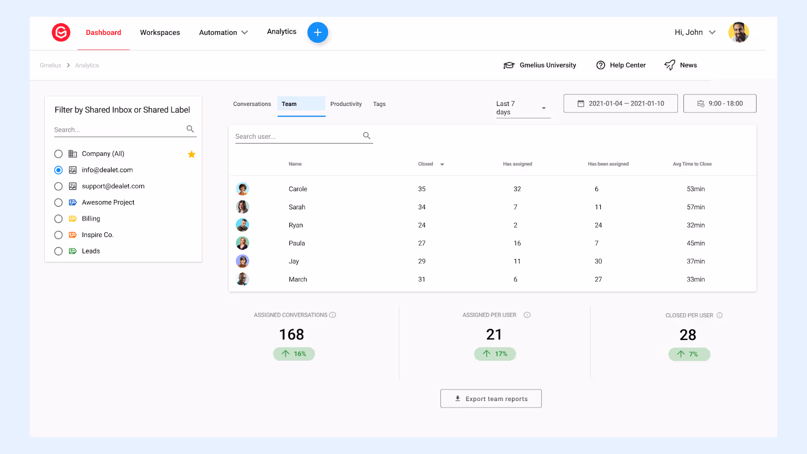 Analyses d'équipe vous permettent de suivre les indicateurs de performance clés (KPI), de contrôler le trafic et la distribution des e-mails, de suivre le temps de résolution et de mesurer la productivité de votre équipe au fil des semaines et des mois. Vous pouvez consulter les conversations attribuées à chaque utilisateur et voir quelles conversations ont été clôturées. Les analyses permettent de réduire le temps consacré à l'enregistrement des tâches et à la collecte de données.