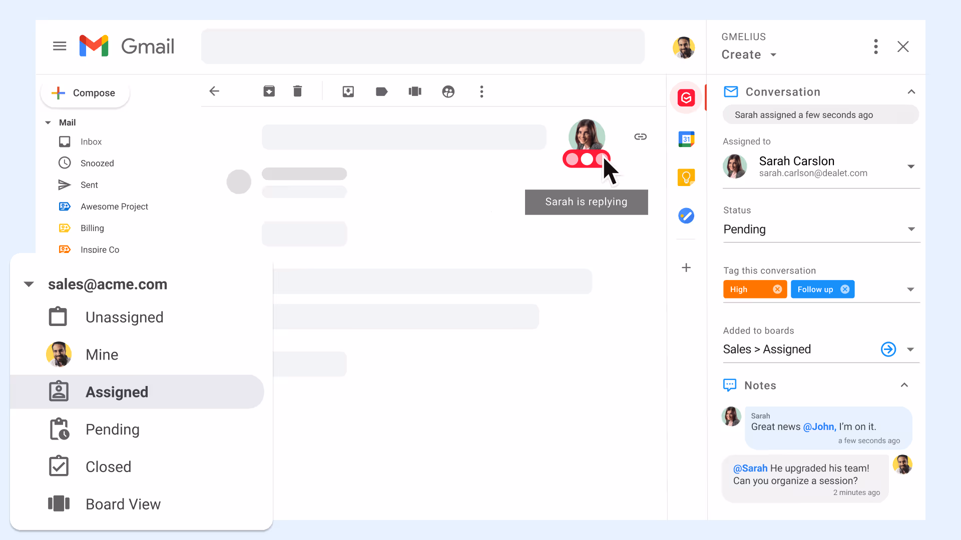 Lorsqu'il s'agit de choisir la meilleure boîte de réception d'équipe pour les clients de Google Workspace, Gmelius se distingue comme la solution la plus performante. Gmelius est une puissante boîte de réception d'équipe qui propose une gamme de fonctionnalités spécialement conçues pour les utilisateurs de Google Workspace et Gmail.