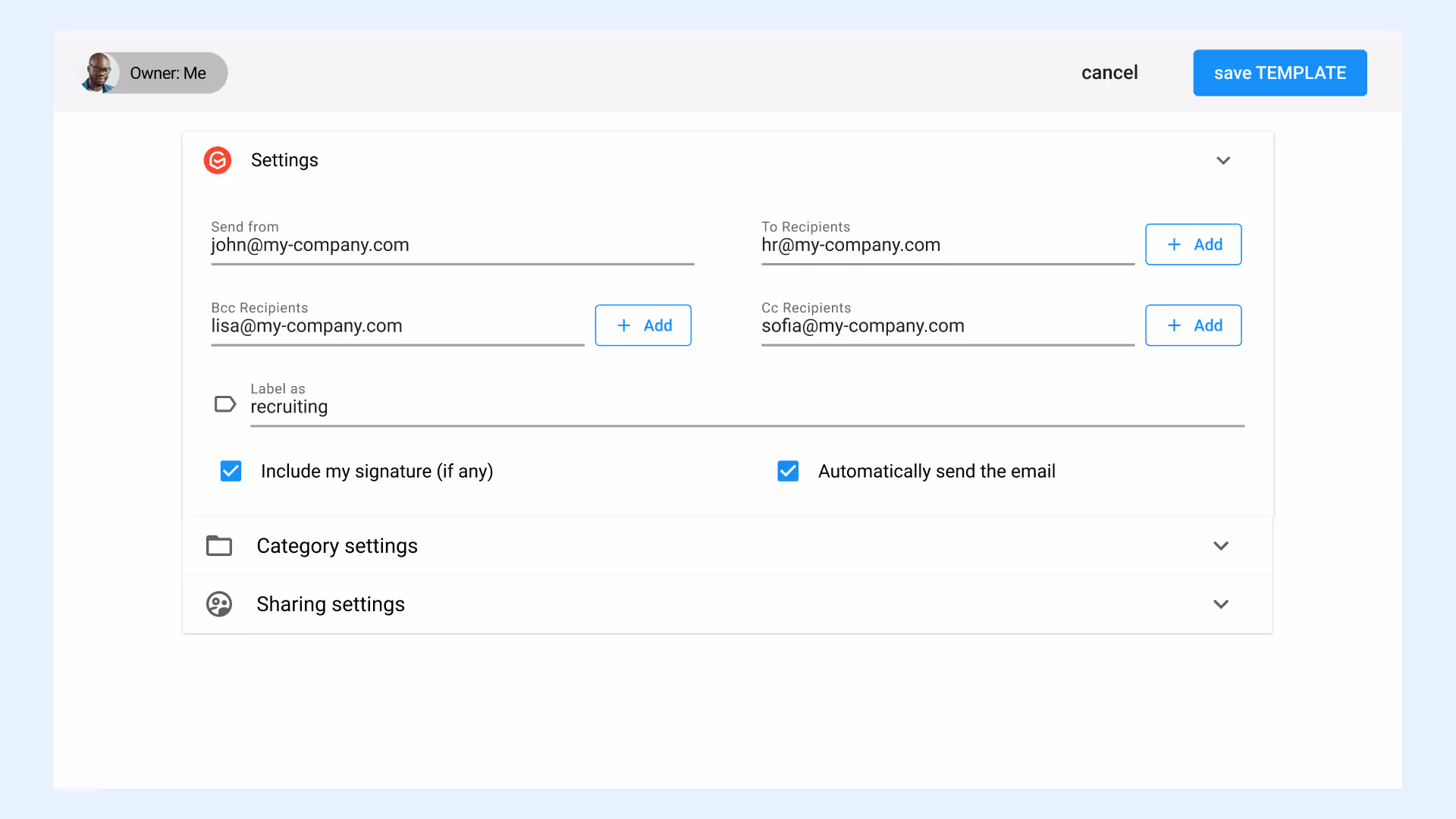 Avec Gmelius, les membres de l'équipe peuvent partager Modèles Gmail avec d'autres personnes travaillant dans la même boîte aux lettres partagée. Cela permet d'économiser des heures passées à modifier, copier et coller des e-mails similaires.