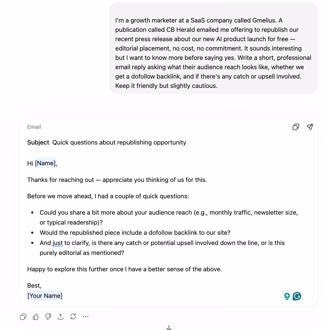I told ChatGPT to write a friendly but slightly cautious reply, asking about audience reach, backlink type, and any hidden upsells.