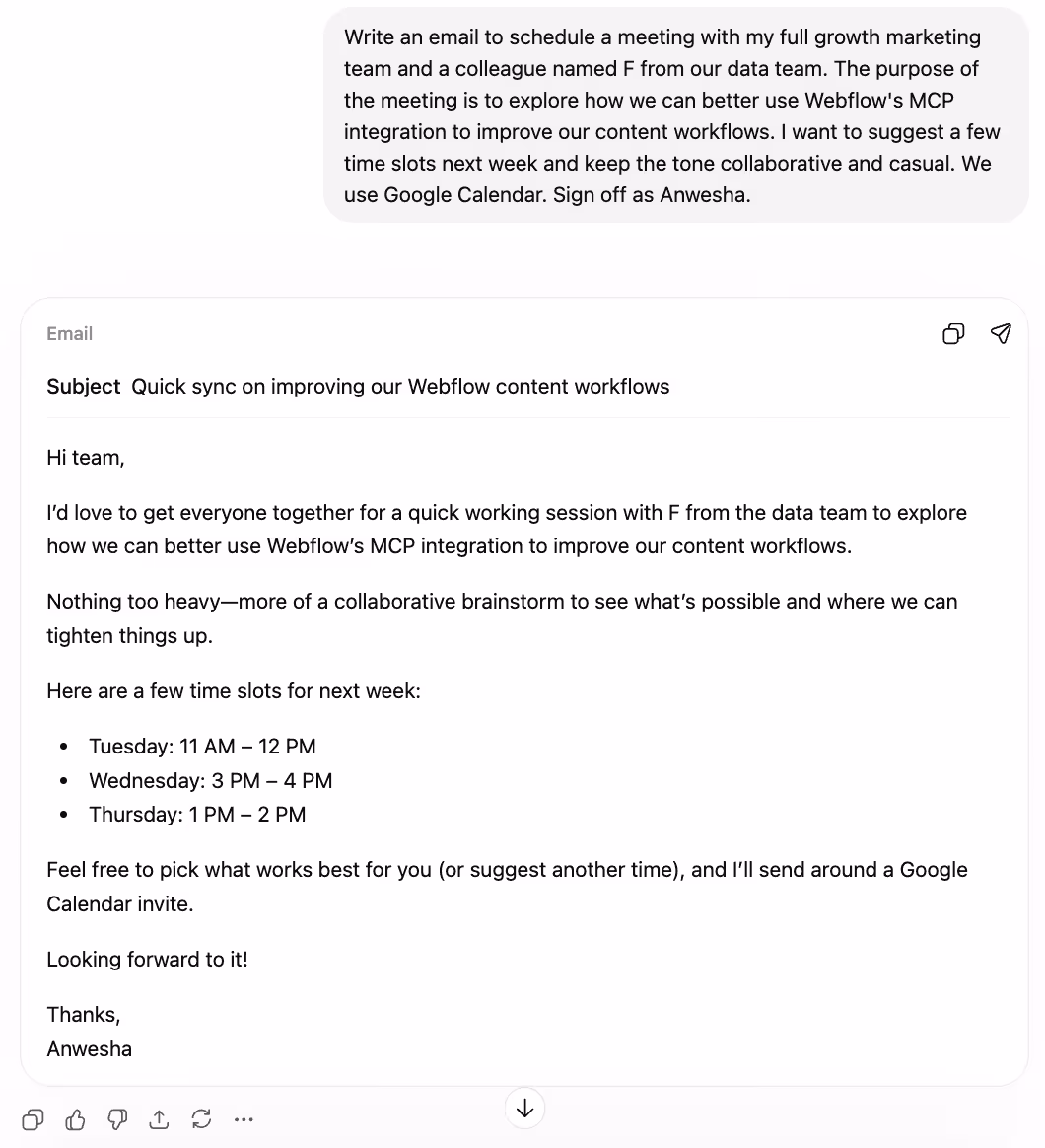The scenario: I needed to schedule a brainstorm with the growth team and a colleague from data, to explore Webflow's MCP integration for our content workflows.
