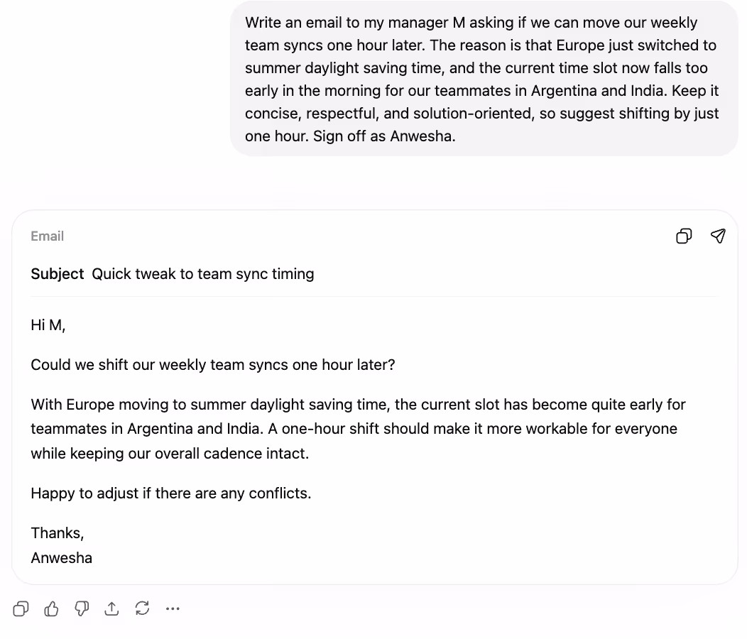 The scenario: Europe's summer daylight saving shift had pushed our weekly syncs to an awkwardly early slot for teammates in Argentina and India. I needed to ask my manager to move it one hour later.