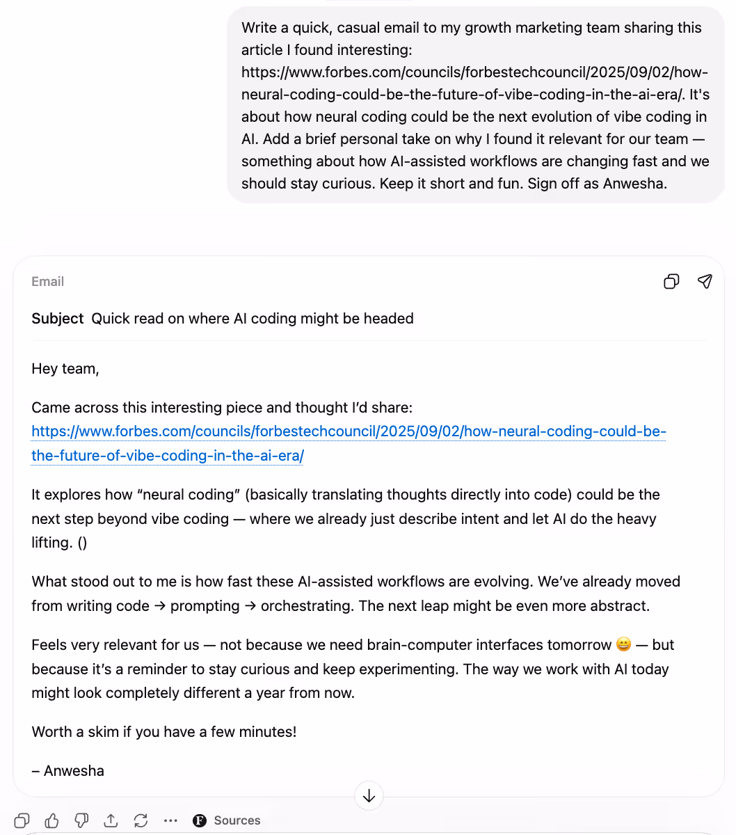 The scenario: I found an interesting Forbes article about neural coding and vibe coding, and wanted to share it casually with the growth team.