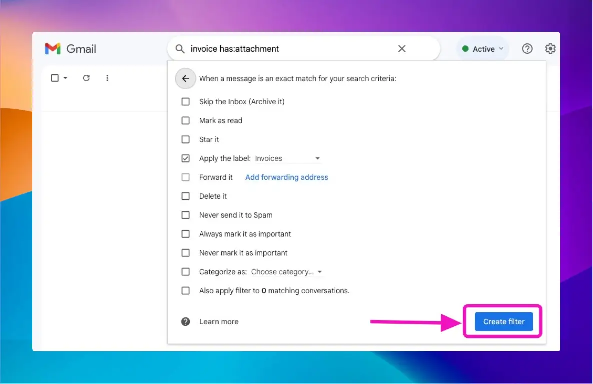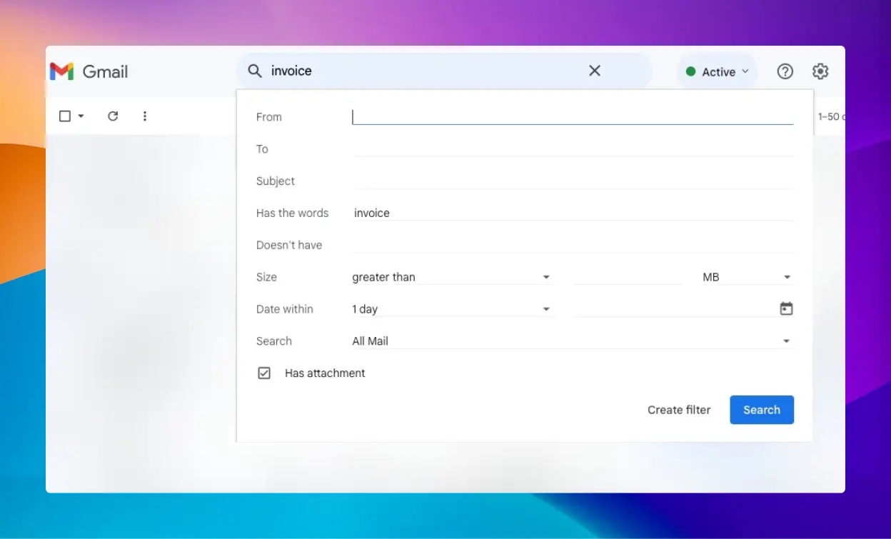 Ouvrez Gmail et lancez la recherche pour un type de conversations par e-mail que vous souhaitez automatiser. Supposons, par exemple, que vous souhaitiez étiqueter automatiquement tous les e-mails contenant le mot « facture » et comportant une pièce jointe.