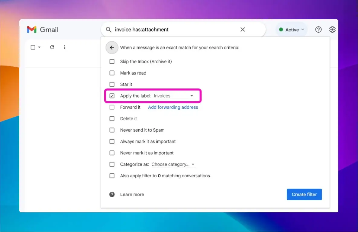 Choisissez « Appliquer l'étiquette » et choisissez une étiquette parmi celles que vous avez créées précédemment, par exemple « Factures ».