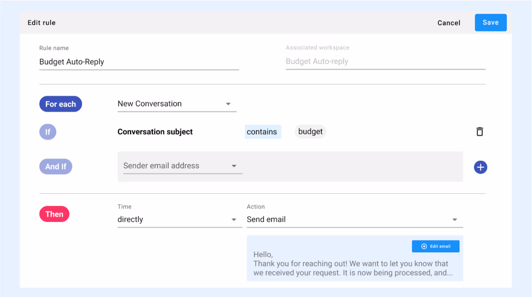 La configuration des répondeurs automatiques est encore plus simple. Les équipes peuvent configurer des déclencheurs et envoyer automatiquement des réponses instantanées en définissant de nouvelles conditions pour chaque boîte aux lettres partagée nécessaire. Notre fonction de réponse automatique utilise les règles « pour chacune », « si » et « alors » pour tirer le meilleur parti de chaque réponse. Par exemple, pour chaque « nouvelle conversation » si un e-mail est reçu en dehors des heures de travail (paramétré selon vos préférences), alors une réponse par e-mail sera envoyée directement.