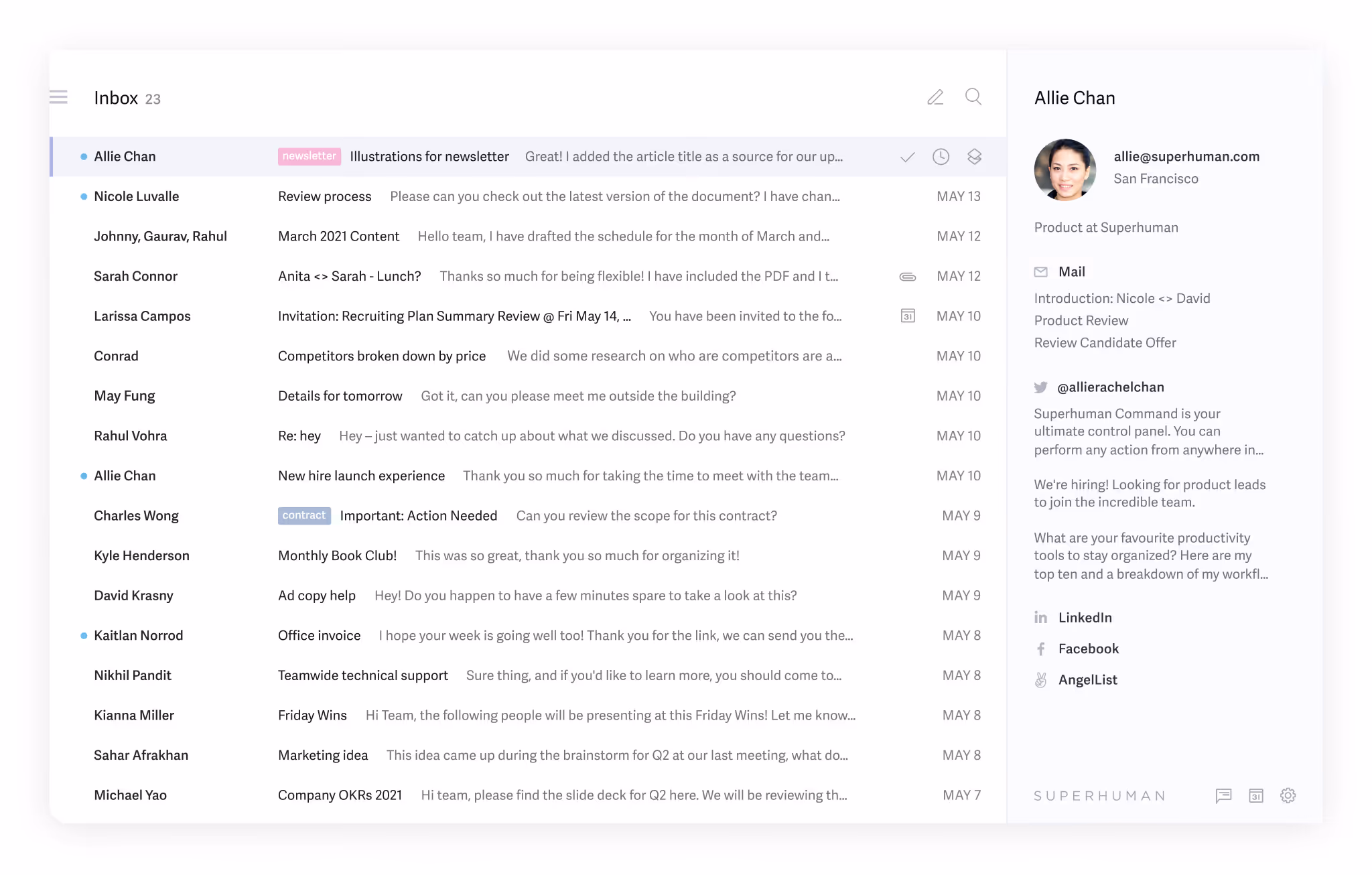 Superhuman’s entire interface is built around navigating without ever touching a mouse. We learned that by simply hitting Cmd+K, you open a command line that lets you snooze, label, or forward emails in milliseconds.