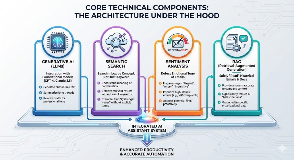 - RAG (Retrieval-Augmented Generation): The most advanced assistants use RAG to safely "read" your historical emails and project documentation. This enables the AI to provide answers that are factually accurate to your company's specific context, significantly reducing the "hallucinations" common in generic AI models.