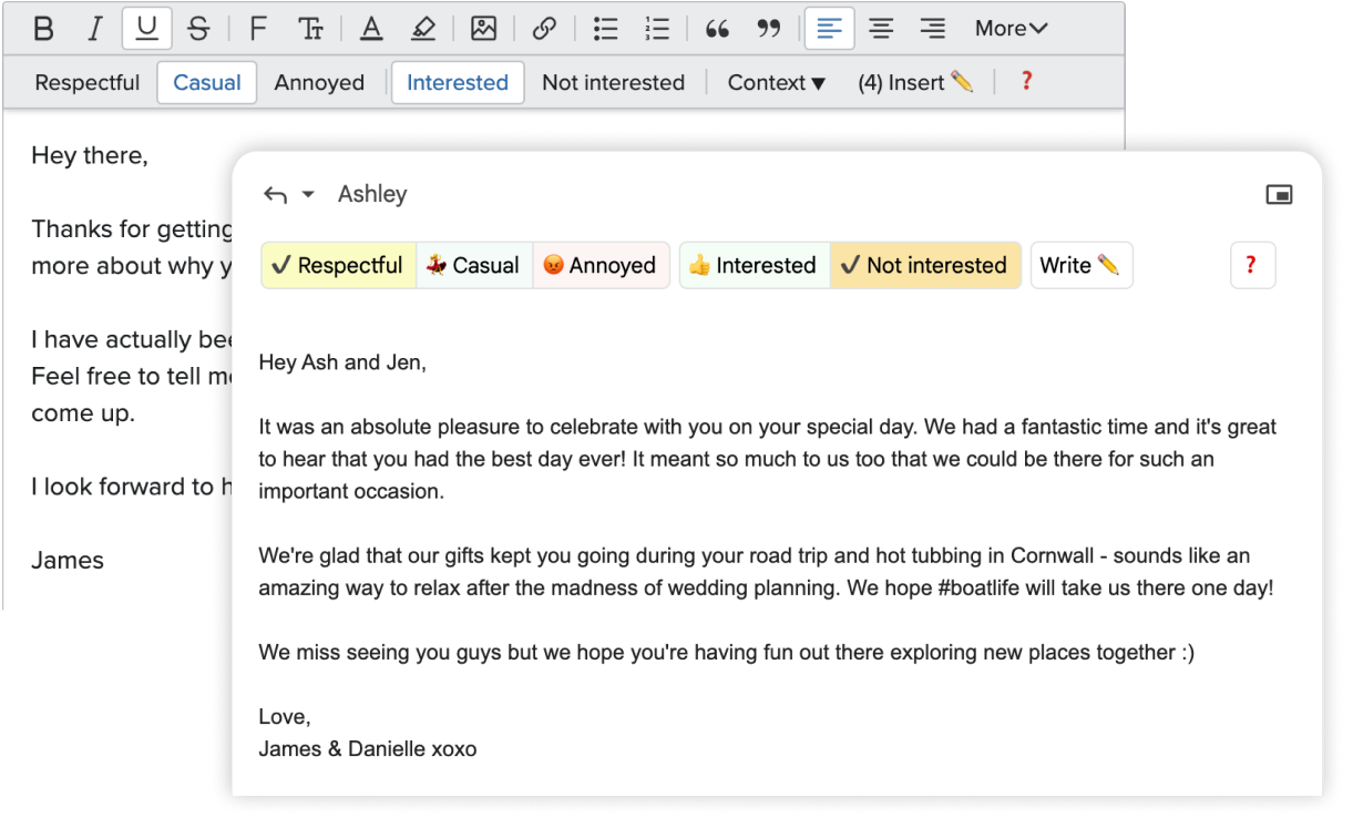 - Tone selector: Offers a wide variety of emotional tones to perfectly match the situation.