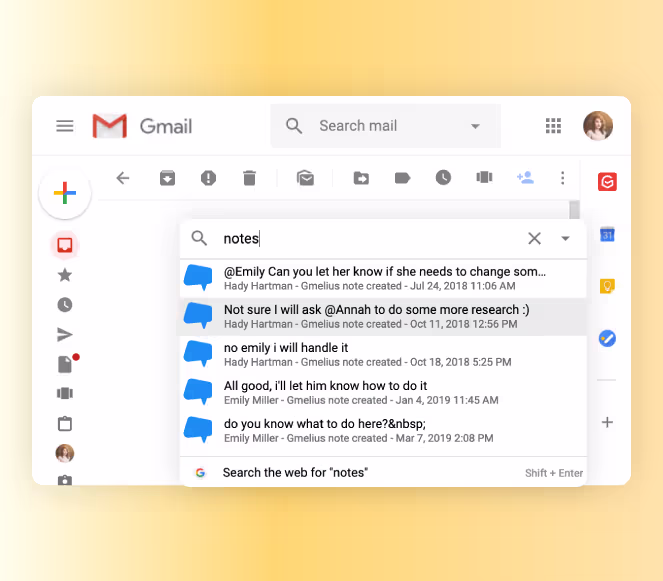If you do need to find Gmelius notes, they are integrated into Gmails search function and easily found by: @mention, date, or a few words from the note.