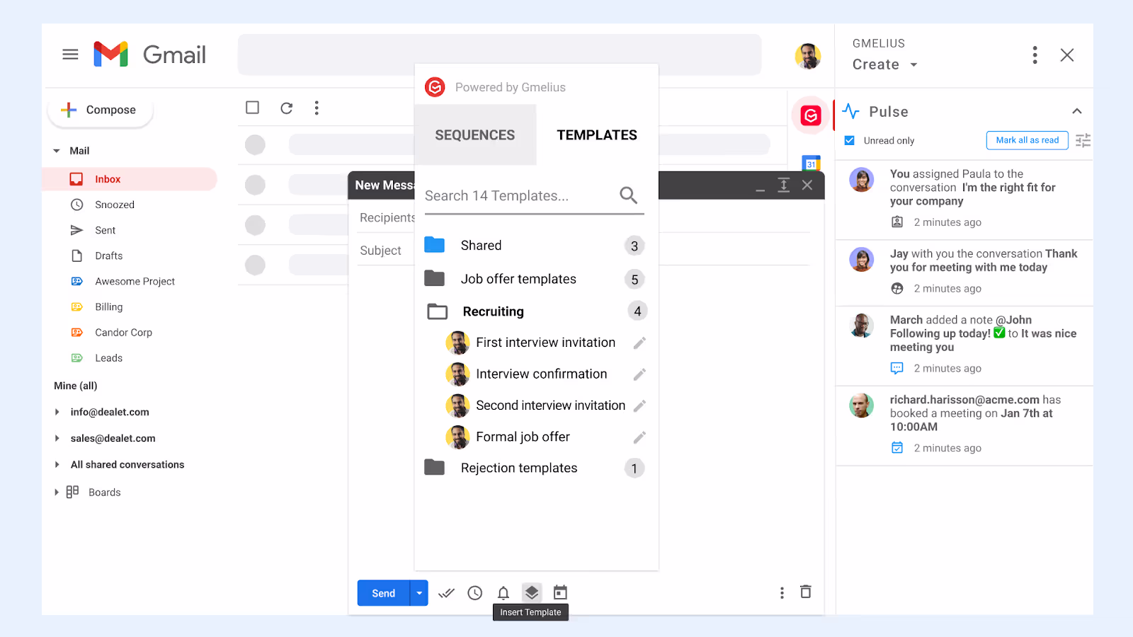 With Gmelius, teams can share new or existing Gmail labels and synchronize conversations in real-time. Gmail shared labels help organize tasks, manage projects, and delegate emails directly from Gmail or other communication platforms that sync with Gmelius.