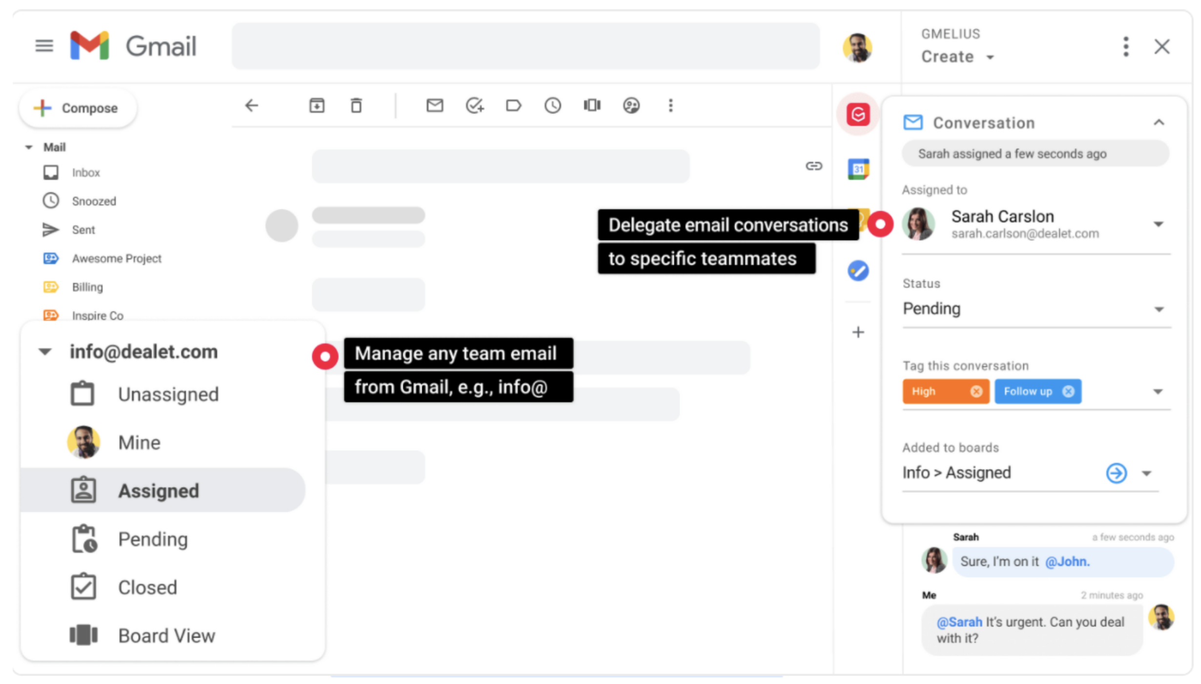 There is no need to learn another organizational tool. Gmelius fits right into your current workflow without leaving your inbox. Once installed, every incoming email will require team communication and collaboration. Collaborating via one platform can help transform how your team manages incoming and outgoing emails. Not only does it provide a way for team members to collaborate better, but Gmelius also offers many features that can contribute to better email management. These include: