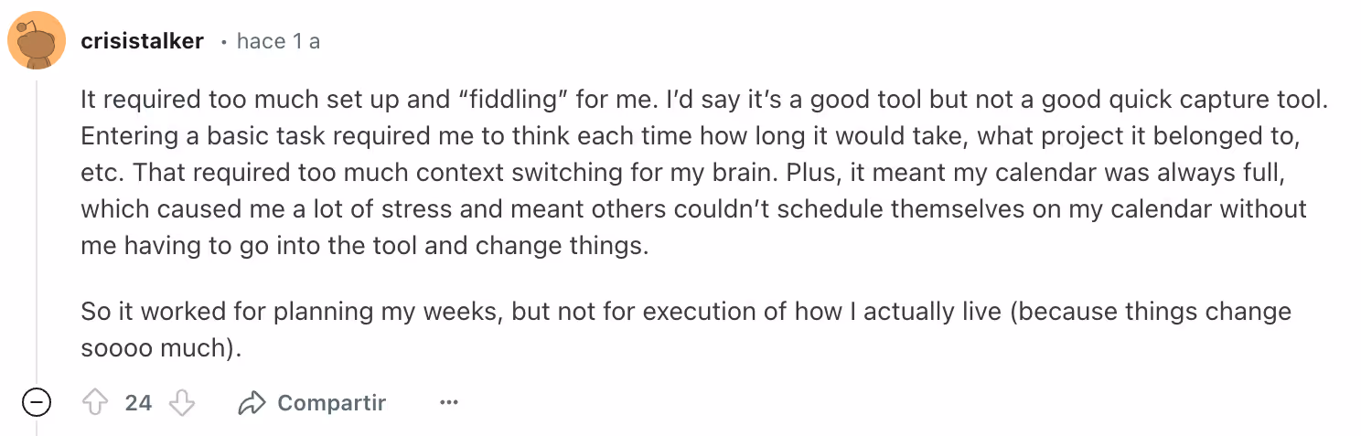 Alguns usuários notaram que a configuração de tarefas exige muita entrada manual, como estimar durações e atribuir projetos, o que interrompe o fluxo de trabalho e aumenta a carga cognitiva.