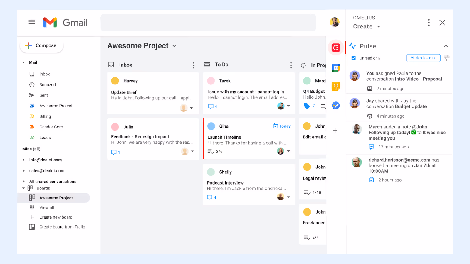 Gmelius oferece Painéis Kanban para o Gmail para que qualquer conversa por e-mail possa ser transformada em uma tarefa e gerenciada visualmente.