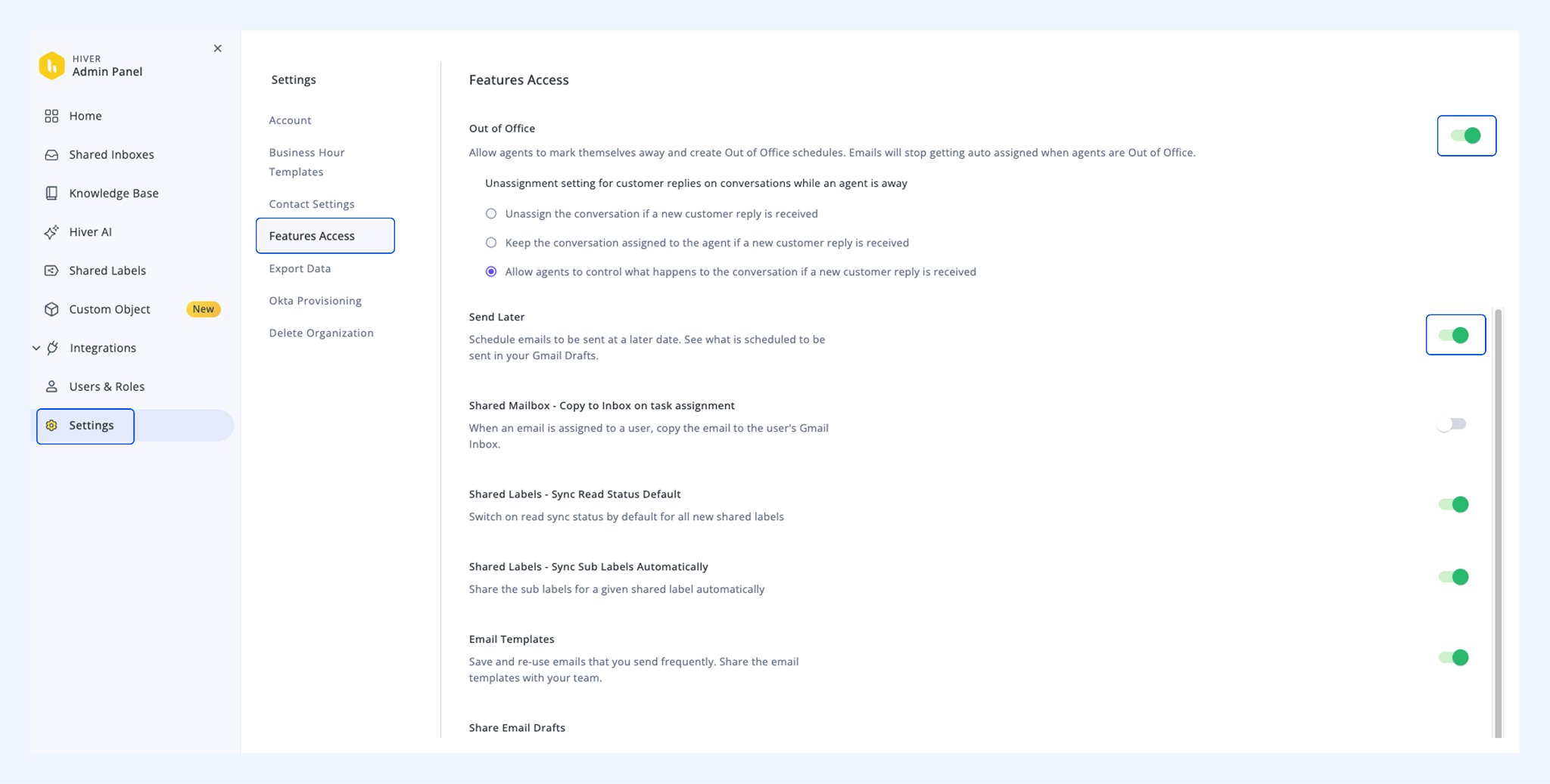 For situations like these, Hiver does offer a way to selectively disable individual features at the admin level without touching the account itself. Only admins can manage feature access, and the path to get there is: