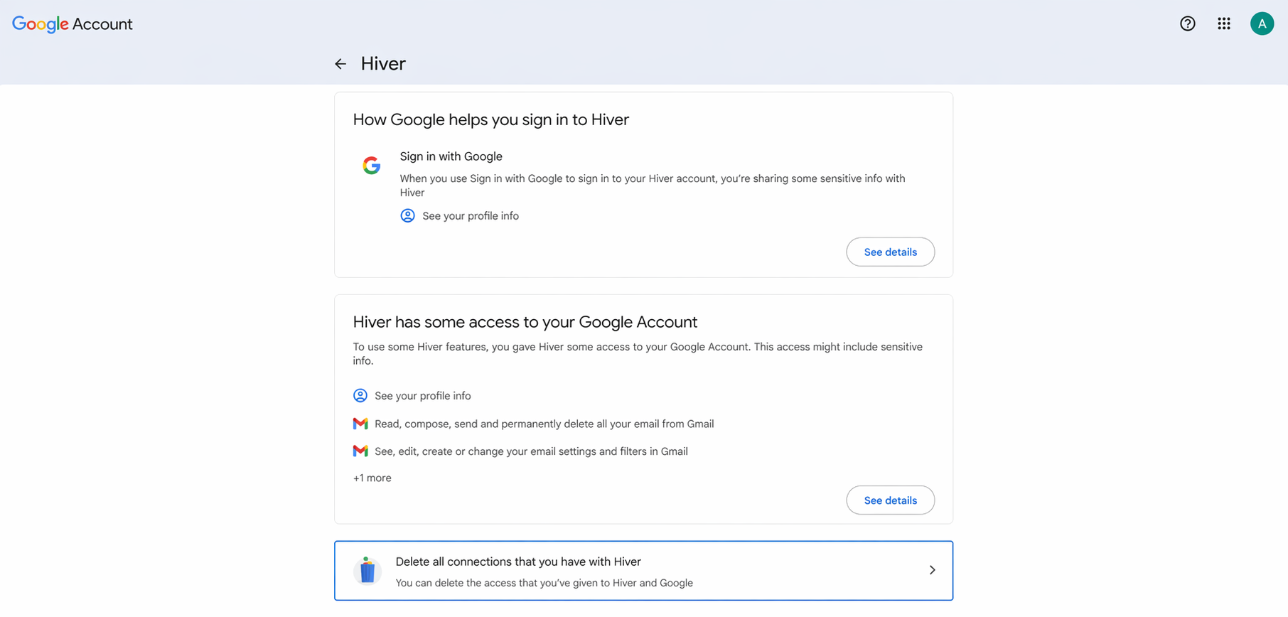 Here's where Google's own account settings become useful. Regardless of where Hiver's internal deletion process stands, users can revoke Hiver's access to Gmail directly through their Google Account — and do it instantly. This cuts off the app's connection to Gmail data without waiting for Hiver's team to action anything on their end.
