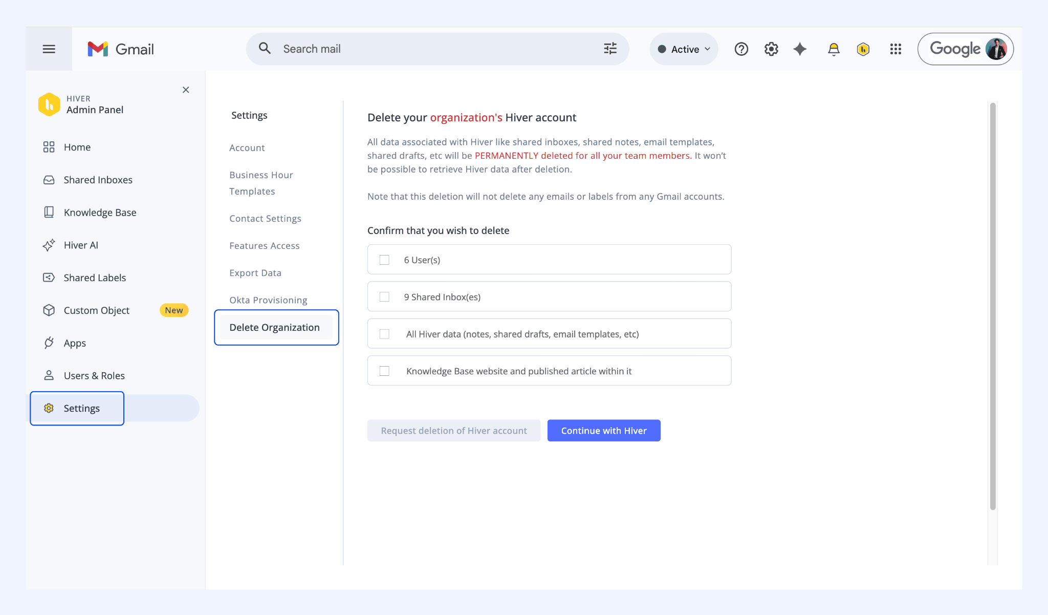 It's also worth knowing that deleting the Hiver account does not remove any labels or emails from the Gmail accounts that were associated with it. What does get permanently removed is everything created within Hiver itself: Shared Inboxes, shared notes, shared templates, and all other Hiver-specific data.